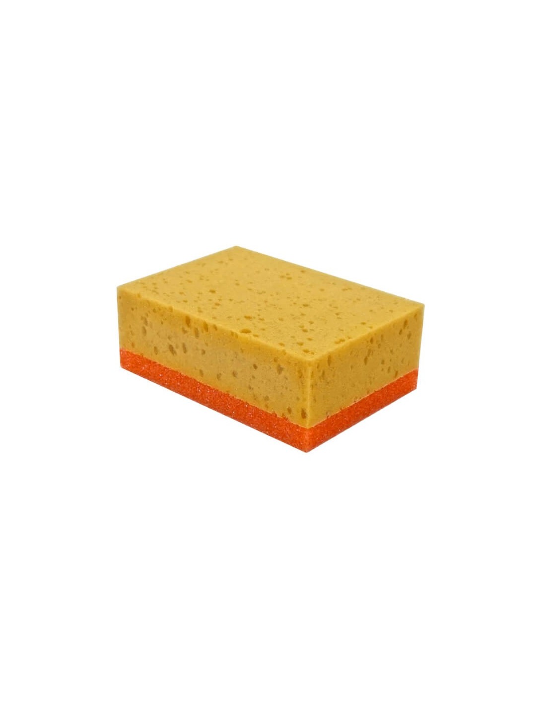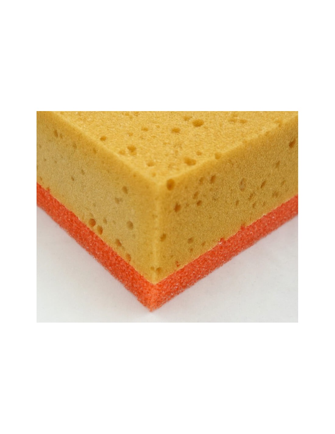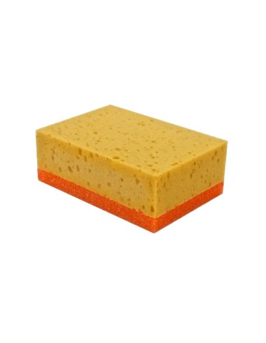 Esponja mixta PU+abrasiva de 20x12x8cm. Esta esponja combina una superficie abrasiva con una base de espuma de poliuretano, ideal para trabajos de limpieza y preparación de superficies.