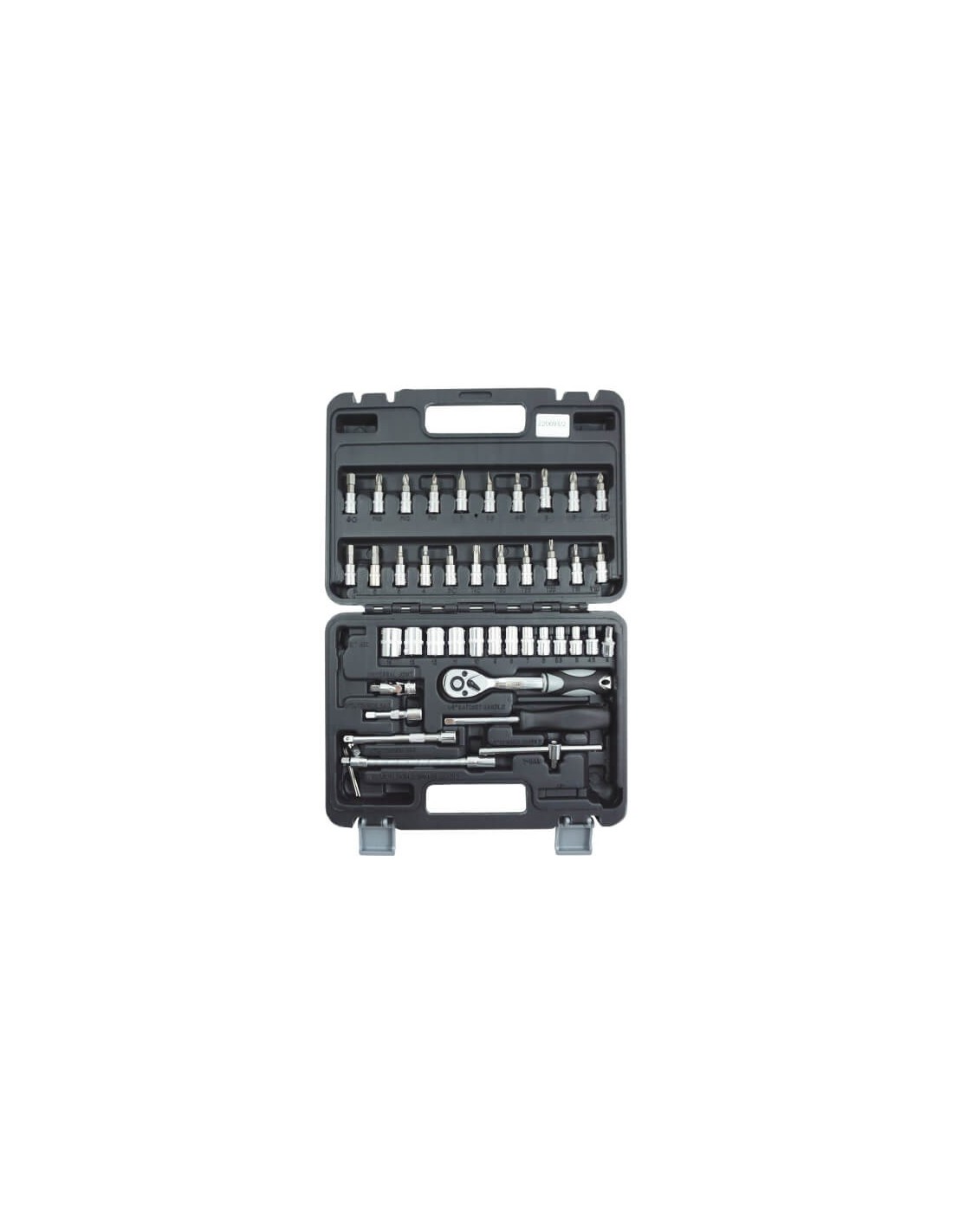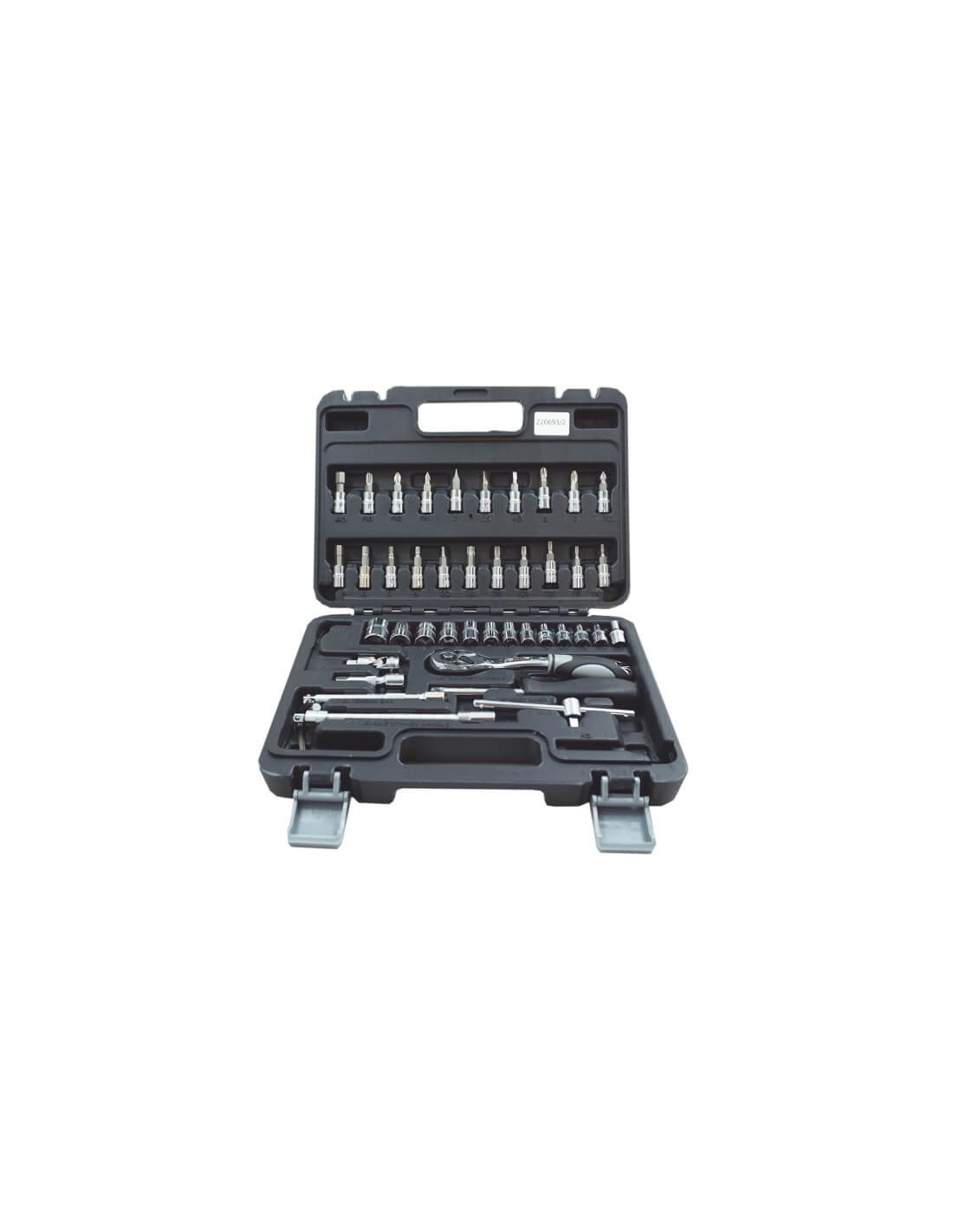 Juego de vasos hexagonales de 46 piezas con carraca de 45 dientes. Este set ofrece una gran variedad de tamaños para adaptarse a diferentes trabajos de reparación.
