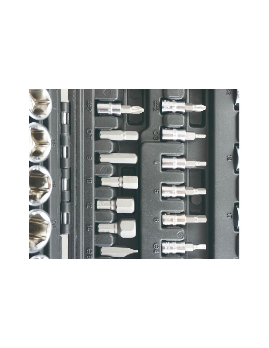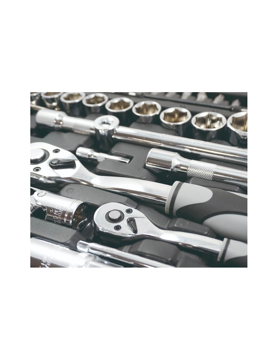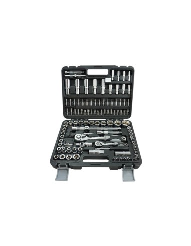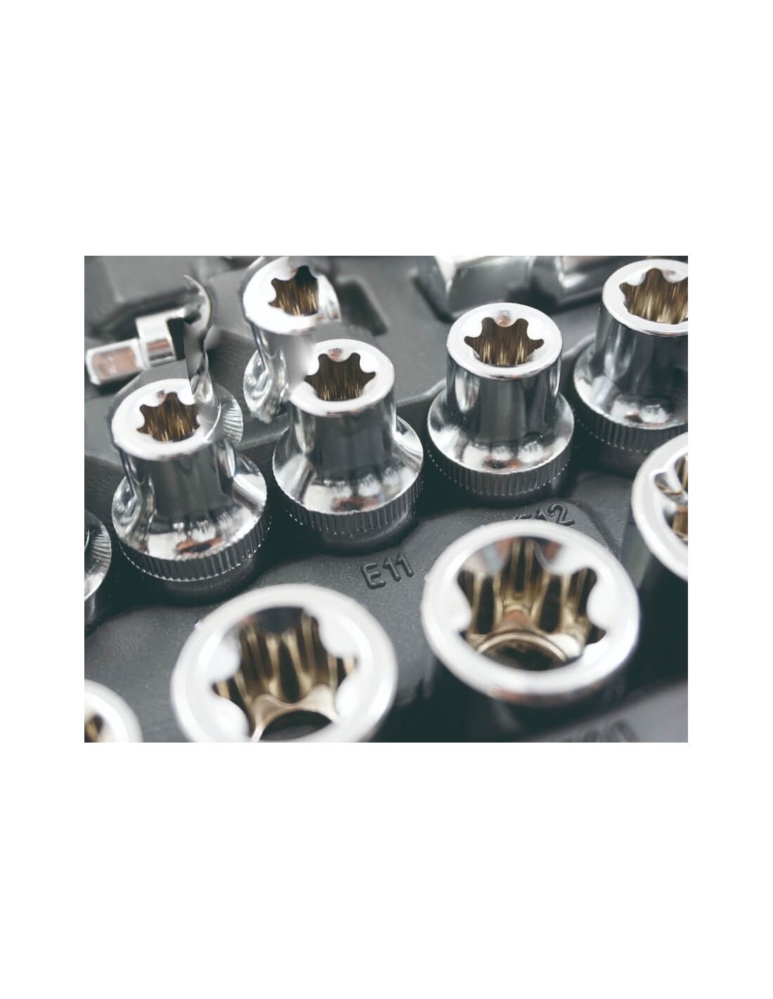 Juego de vasos de 110 piezas con carraca de 72 dientes y vasos TORX de seguridad. Este set profesional incluye una amplia gama de vasos y puntas de seguridad TORX.